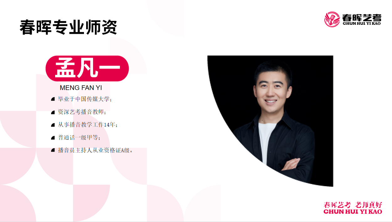 毕业于中国传媒大学,资深艺考播音教师,从事播音教学工作14年,普通话一级甲等,播音员主持人从业资格证A级。